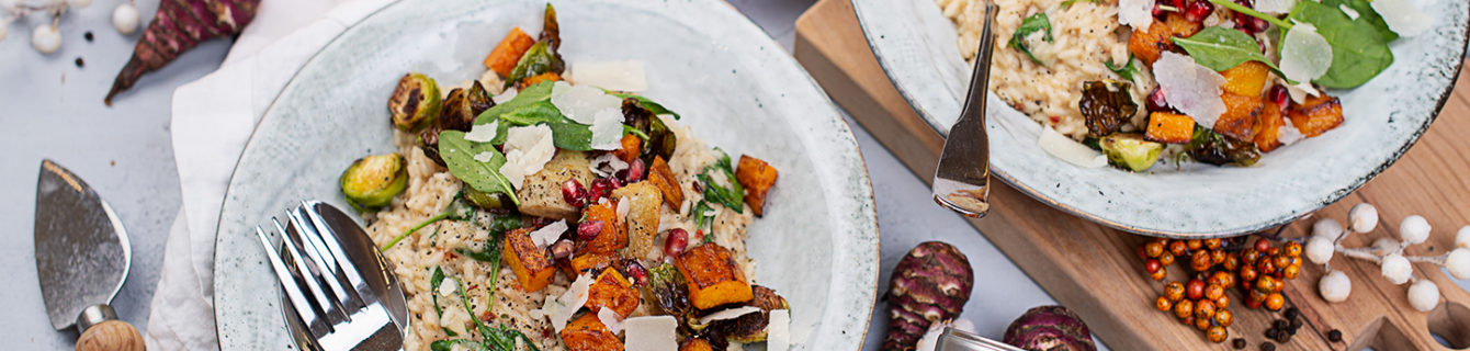 Das Risotto in tiefe Teller geben. Mit dem Gemüse und mit Granatapfelkernen und Parmesanspänen garniert sofort, noch warm servieren.